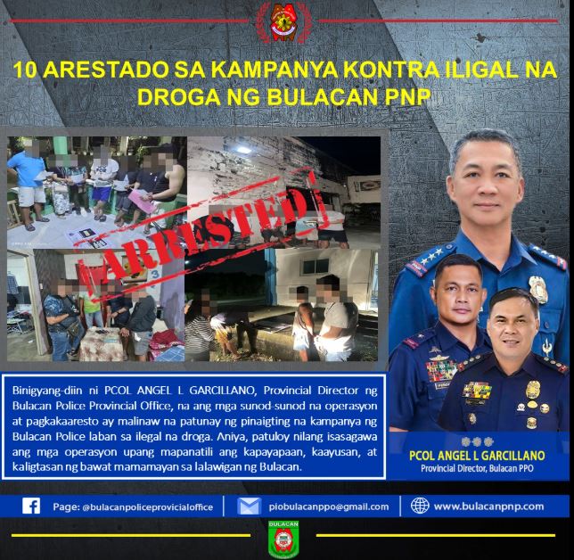 10 ARESTADO SA KAMPANYA KONTRA ILIGAL NA DROGA NG BULACAN PNP
