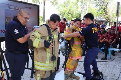 During the demonstration, four participants experienced wearing firefighting equipment which consisted of bunker gear, boots, helmets, gloves, masks, and breathing apparatus.
