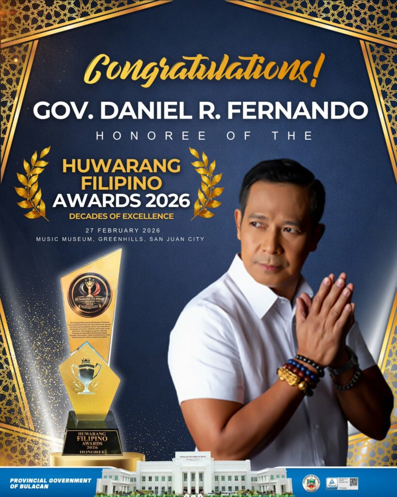 CITY OF MALOLOS – Bulacan Governor Daniel R. Fernando received the Huwarang Filipino Awards 2026 Honoree recognition during the “Decades of Excellence” awarding ceremony held at the Music Museum in San Juan City last Friday.