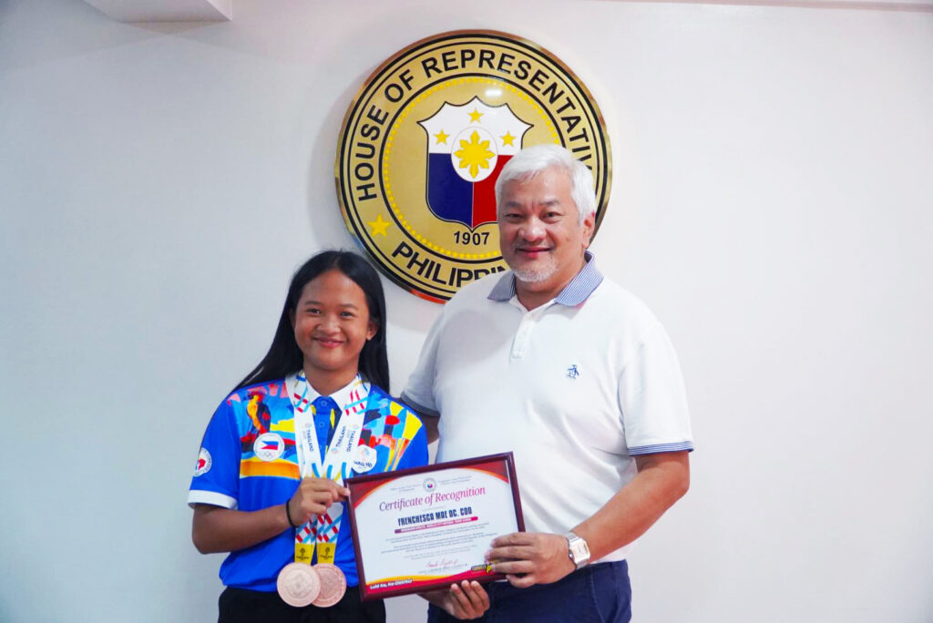 Congressman Carmelo “Pogi” Lazatin, Jr. awards Certificates of Recognition and cash incentives to the members of the Open Wakeboard Team who bagged the Bronze Medal in the SEA Games 2025 — Derek Hewitt, Frenchesca Mae Coo, and Mark Louie Camomot, together with Coaches Carlo Dela Torre and Jianna Dela Torre.