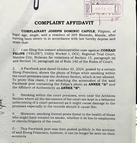 Ang complaint ay isinampa ni Capule sa Supreme Court noong Abril 11, 2025 kung saan sinabi nito na ang naging aksyon ni Felipe sa paggamit umano ng vape sa vicinity ng RTC Malolos sa bahagi ng ‘Archive Section’ ng OCC ay “are clearly vulgar and unbecoming of a court personnel”.