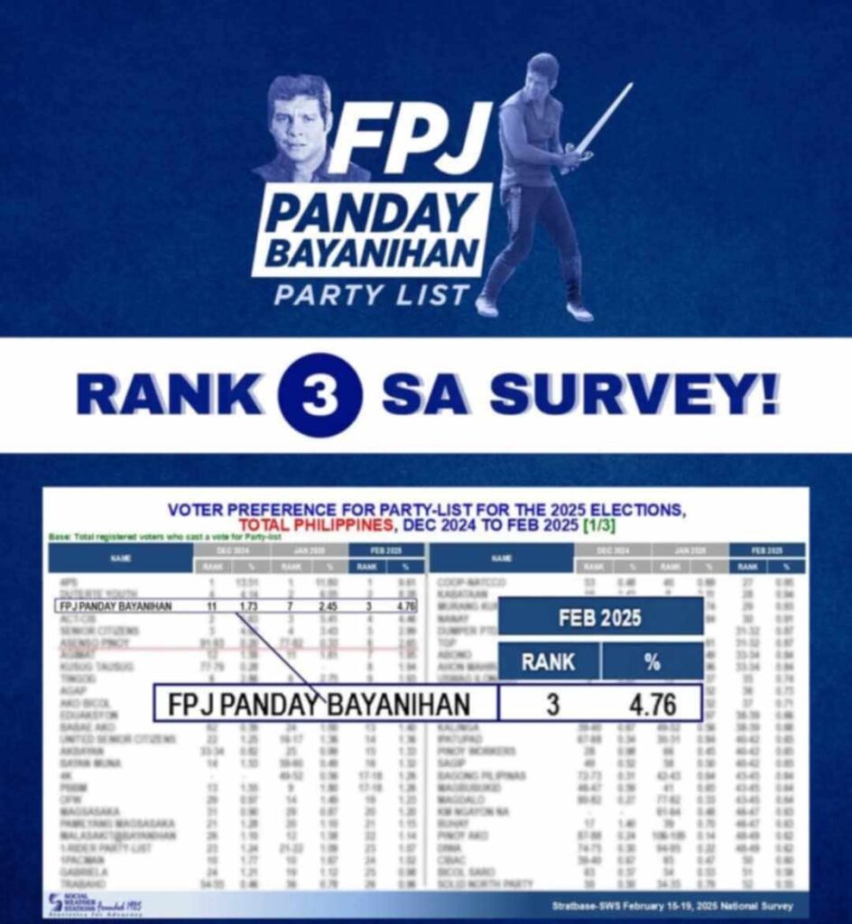 FPJ Panday Bayanihan partylist continues to gain considerable support from the public, as seen in its remarkable rise to number 3 in the latest Social Weather Stations (SWS) survey.