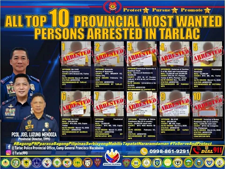 Meanwhile, in Tarlac, the Police Provincial Office under PCOL Joel Mendoza likewise achieved a full arrest rate of its Top 10 Provincial MWPs ahead of the scheduled April 1–5 manhunt operations.
